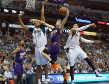 Goran Dragic (1) ante Brandan Wright (34) y Shawn Marion (0).