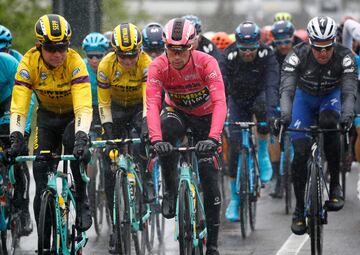 El Primer Ministro italiano Giuseppe Conte en la salida con Roglic y Ackermann.