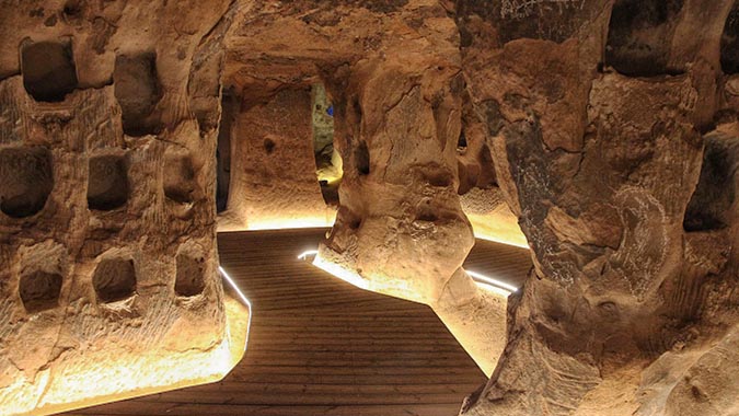 En el interior del cerro de San Miguel se halla este sorprendente patrimonio rupestre, un complejo entramado de galerías y cámaras comunicadas entre sí y excavadas sobre arenisca, cuyo origen podría remontarse a los siglos VI o VII después de Cristo. Además de la Cueva de los cien pilares, seña de identidad de la ciudad y la más antigua, Arnedo cuenta con numerosas cuevas que han sido usadas como bodegas, almacenes, corrales, pajares e incluso han estado habitadas. Este interesante fenómeno rupestre está abierto al público.