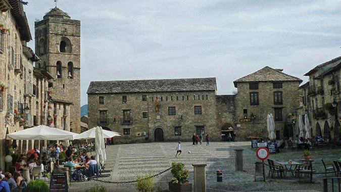 Uno de los lugares más admirados por los turistas que visitan Aínsa es su Plaza Mayor. La capital de la comarca de Sobrarbe, en el alto Pirineo oscense, tiene una plaza medieval de grandes dimensiones que parece datar de los siglos XII y XIII. Escenario de fiestas y mercados, la plaza cuenta con numerosos restaurantes, así como con dos prensas comunales de vino que utilizaban todos los vecinos del pueblo que no tenían la suya particular para obtener el mosto del las uvas de la cosecha. Uno de los elementos característicos de la plaza son sus porches laterales, con una sucesión de arcos de medio punto y diversos ojivales. En la Plaza Mayor está el Ayuntamiento y se divisa el castillo.