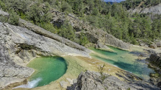 Una de las excursiones más bonitas desde Aínsa es a las Pozas de San Martín en el río Sieste. Uno de los elementos más llamativos y sorprendentes para los visitantes es el color esmeralda del agua. Este lugar es la mejor combinación de montaña y baño. La mejor época para visitarlas es la primavera, ya que, con el deshielo, el agua baja con fuerza y deja una bonita estampa. La ruta no es solo apta para expertos excursionistas. Una de las características más peculiares es que no hay un solo camino para hacer la ruta, sino que puedes ir por la senda o, si el agua no fluye con fuerza, puedes ir mojándote los pies por el barranco.
