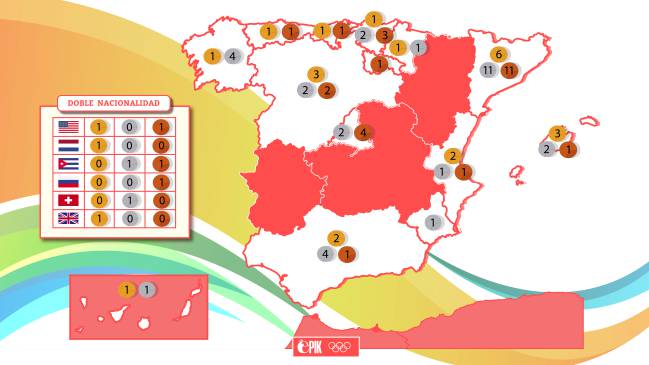 Y para cerrar el apartado regional, solo resta echar un vistazo al desglose 'provinciano' de Río 2016. De las 17 medallas conseguidas, 12 corresponden a deportistas individuales. Entre ellos hay tres catalanes y cuatro medallas (Belmonte, Craviotto y Joel González). Ganan la olimpiada de Brasil, como habitualmente. Después encontramos a País Vasco, Andalucía y Cantabria, con un oro cada una; Maialen, Marín y Beitia, respectivamente. Reino Unido se adjudica otro oro, con Cuba por detrás gracias a la plata de Orlando Ortega. También encontramos a Madrid con una plata, la de Eva Calvo, mientras que Castilla y León y La Rioja se adjudican un bronce cada una (Valentín y Coloma Nicolás).