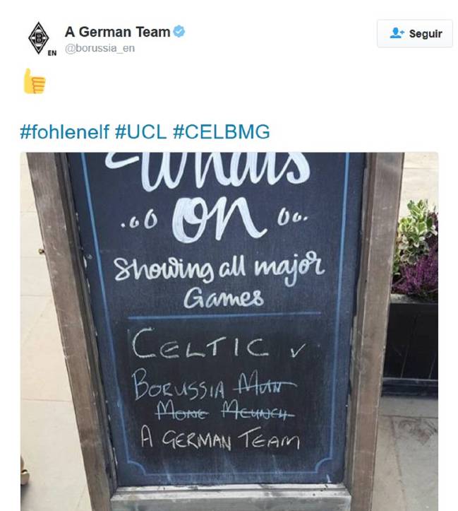 El motivo de este cambio llega después de que los responsables del Twitter del equipo se hicieran eco del cartel de un pub escocés en el que se podía leer el típico anuncio de la hora del partido junto con tres intentos de escribir su nombre sin conseguirlo. Al final, el regente del bar escocés ha tirado a lo fácil: "Un equipo alemán", guante que el Mönchengladbach ha recogido con maestría.