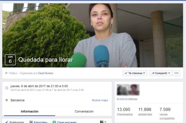 La gente está quedando para llorar el 6 de abril. Sí, así, como lo lees. Estamos tan saturados de todo que lo mejor será reunirnos todos para contarnos nuestras miserias y desahogarnos a moco tendido. Eso, probablemente, es lo que pensasen los primeros que se unieron a un evento en Facebook con el nombre de 'Quedada para llorar' y convocada en Barcelona que ha llegado ya a los 11.300 "asistentes" y casi 13.000 "interesados" en ir. Y no solo eso: desde hace varios días se han creado varios eventos más para el mismo día (6 de abril) con el mismo nombre pero distinta sede: las lágrimas también caerán en Madrid, Sevilla y Valencia.