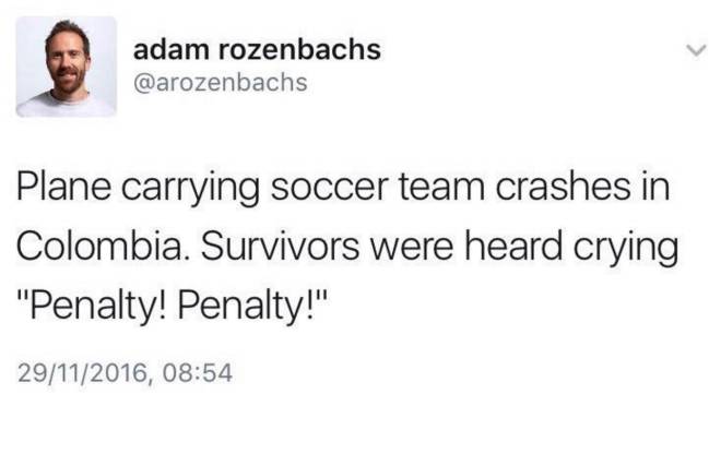 Además de consternación, la jornada del accidente de avión del Chapecoense ha dejado polémica. Adam Rozenbachs, humorista australiano, tuitéo este mensaje: "Un avión que transportaba a un equipo de fútbol se estrelló en Colombia. Se escuchó a los sobrevivientes gritar '¡Penalty! ¡Penalty!' ". Las críticas de los usuarios no tardaron en llegar.
