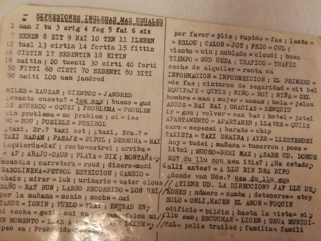 Esta "guía de inglés para taxistas" ha sido recuperado por el tuitero @Picahierros, sumando más de 25.000 retuits en apenas unas horas. El tuitero ha explicado que la guía -una especie de chuleta, pertenece al padre de un amigo suyo que había sido taxista.