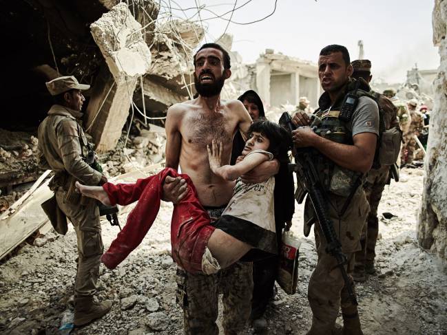 Un padre desesperado lleva a cuestas a su hijo herido en Mosul, Irak. Fotografía por Zach Lowry.