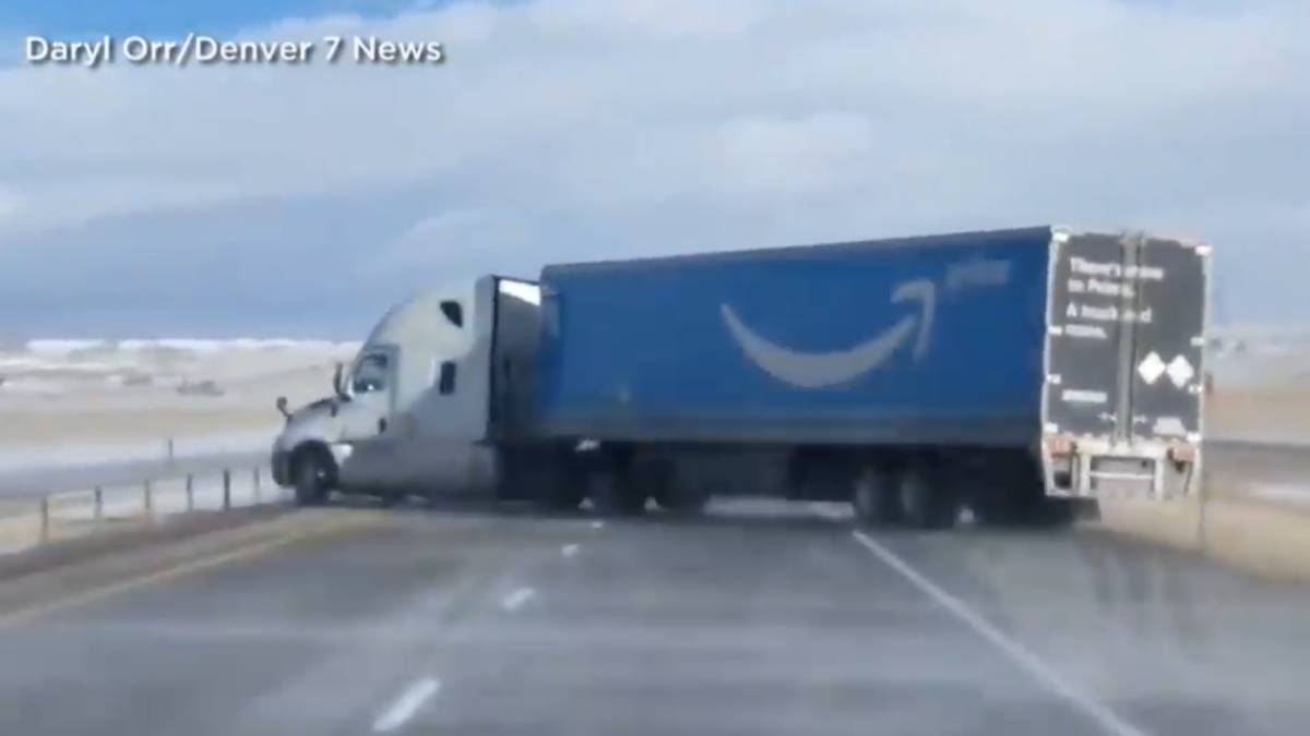 Tremendo: el viento saca de la autopista a un camión de Amazon