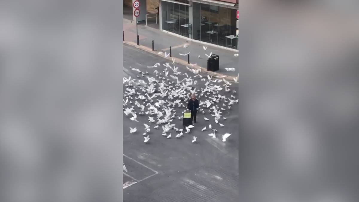 Nadie da de comer a las gaviotas por el confinaniento y esto ha producido escenas como esta donde no han parado de perseguir a una señora con su carro  de la compra.