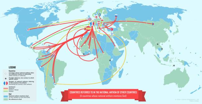 Según un mapa elaborado por usuarios de Reddit, y que también recoge Strambotic, España tiene citas en 13 países donde sus himnos dejan algún recado sobre su pasado en común.