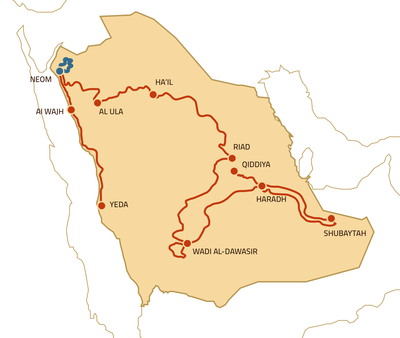 El bucle de salida de la futura megalópolis de Neom es una joya. Llevando a los participantes a los confines de la frontera jordana, el rally propone una sucesión de cañones y montañas que explorarán sobre una alfombra de arena. En esta especial, el Dakar se elevará a su punto más alto: 1.400 metros de altitud.