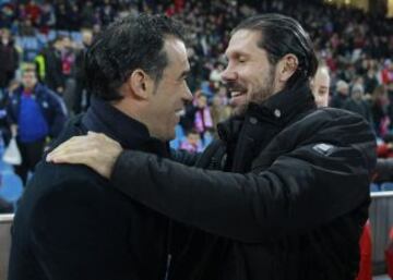 El entrenador de Atlético de Madrid, el argentino Diego Pablo Simeone (d), saluda a Luis García (i), entrenador del Getafe, durante el partido, correspondiente a la jornada decimocuarta de Liga en Primera División.