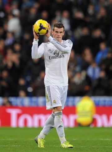 Real Madrid-Valladolid. Bale, jugador del partido, se lleva el balón con el que ha realizado el hat trick.