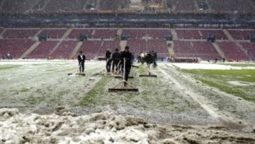 El mal estado del césped debido a las nevadas es evidente.