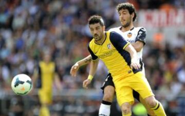 El defensa portugués del Valencia João Pereira (i) con el balón ante el delantero del Atlético de Madrid David Villa (d) en el partido de la trigésima quinta jornada de liga de Primera División, disputado esta tarde en el estadio de Mestalla.