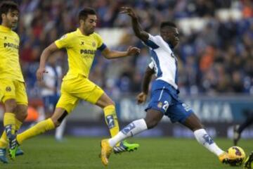 El delantero ecuatoriano del RCD Espanyol Felipe Caicedo avanza con el balón ante el centrocampista del Villarreal Bruno Soriano, durante el partido de la undécima jornada de liga de Primera División que ambos equipos disputan hoy en el estadio Cornellà-El Prat.
