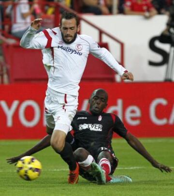El centrocampista del Sevilla Aleix Vidal pelea un balón con el centrocampista francés del Granada Abdoulwahid Sissoko, en partido de la decimotercera jornada de la liga en Primera División que se disputa esta tarde en el estadio Ramón Sánchez Pizjuan