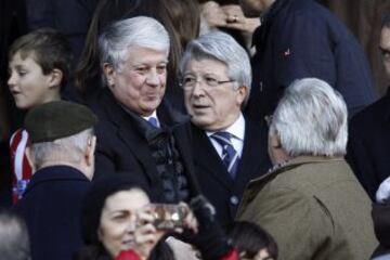 El presidente del Atlético de Madrid, Enrique Cerezo, junto al expresidente de la patronal madrileña CEIM, Arturo Fernández en el palco del estadio Vicente Calderón donde asisten al partido de la decimoséptima jornada de Liga de Primera División