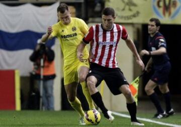 El defensa del Ath. de Bilbao, Óscar de Marcos, disputa un balón con el centrocampista del Villarreal, Denis Cherychev, durante el encuentro correspondiente a la jornada diecinueve de primera división.