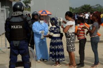 Los seguidores deben aguantar largas colas, debido a los controles de seguridad y a las medidas de higiene contra el Ébola.