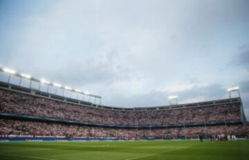 Ambiente en las gradas momentos antes del partido de ida de cuartos de final de Liga de Campeones, que el conjunto rojiblanco disputa ante el Real Madrid esta noche en el estadio Vicente Calderón.
