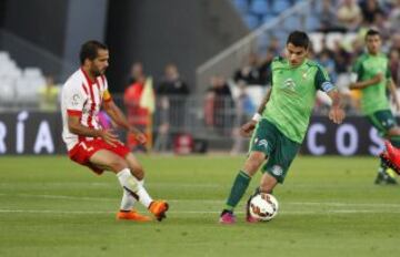 1-2. El centrocampista del Almería Javier Espinosa, con el balón, tras marcar su compañero Thievy Bifouma el primer tanto almeriense.