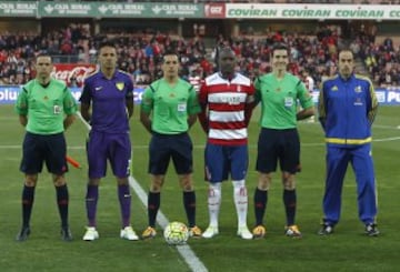 El árbitro Eduardo Prieto Iglesias acompañado por sus asistentes Francisco Javier García, Joan Mendez, el cuarto árbitro Oscar Sauleda y los capitanes Jorge Molina y Juanfran