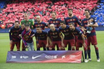Once del Barcelona. De pie: Ter Stegen, Mascherano, Rakitic, Piqué y Busquets. Agachados: Messi, Dani Alves, Neymar, Iniesta, Luis Suárez y Jordi Alba.