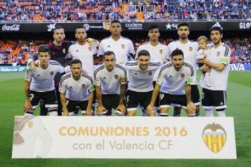 El once inicial del Valencia. De pie: Domenech, Vezo, Santos, Danilo, André Gomes y Parejo. Agachados: Santi Mina, Piatti, Alcácer, Siqueira y Barragán.