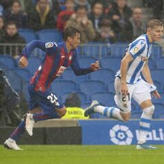 - Oyarzabal: Estaba pasando desapercibido hasta que marcó un gol que fue anulado por fuera de juego de Portu. Pero en la segunda parte ya hizo un gol legal y entonces se desató. Exigió constantemente a De Blasis, al que le amargó la tarde; y dio otra asistencia de gol. Siempre aparece cuando se le necesita.