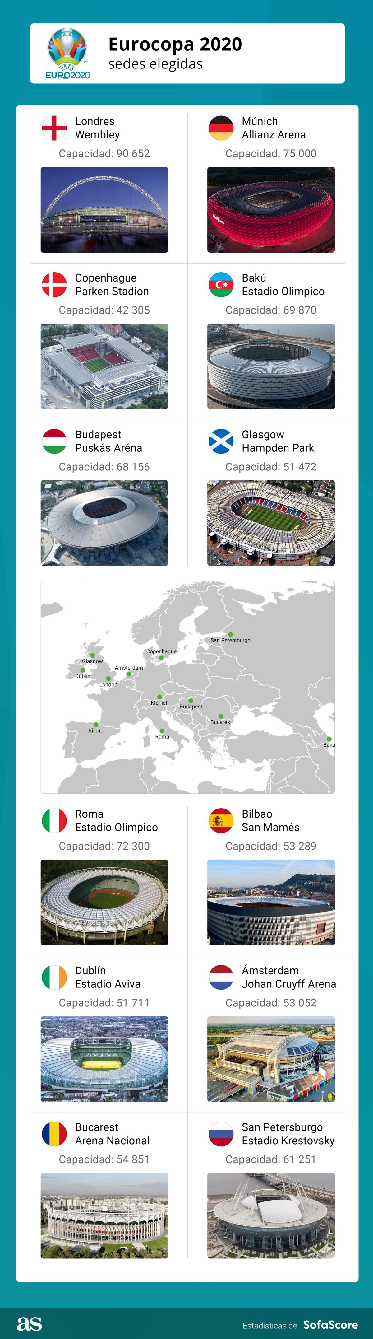 Los movimientos y alteraciones que ha sufrido la Euro 2020 a consecuencia de la pandemia han desfigurado un torneo que comenzó como el sueño de Platini de englobar Europa y puede terminar siendo engullida por esa misma ambición. De momento lo que se sabe es que se celebrará un año más tarde de lo previsto (del 11 de junio al 11 de julio de 2021) y que será, a priori, en 12 sedes, las mismas que la UEFA eligió al oficializar este novedoso formato: San Petersburgo, Bakú, Bilbao, Dublín, Londres, Glasgow, Roma, Copenhague, Múnich, Budapest, Bucarest y Amsterdam.