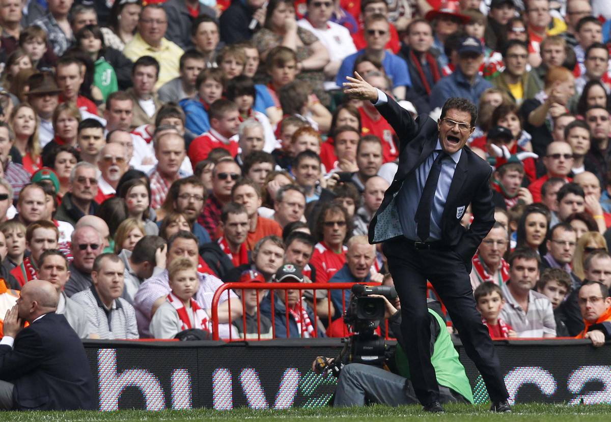 Capello da instrucciones a los jugadores ingleses contra Gales. STEFAN WERMUTH (REUTERS)