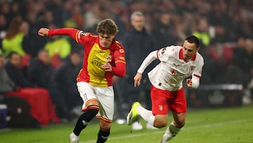 Remate fallado por Aske Adelgaard (Go Ahead Eagles) remate con la izquierda desde fuera del área que se le va demasiado alto.