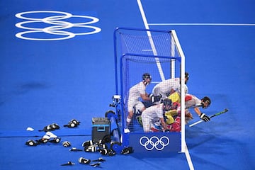 El portero español Francisco Cortés (en rojo y amarillo) y sus compañeros defienden su portería durante un corner corto a favor de Bélgica durante el partido de cuartos de final masculino de la competición de hockey sobre césped de los Juegos Olímpicos de Tokio 2020
