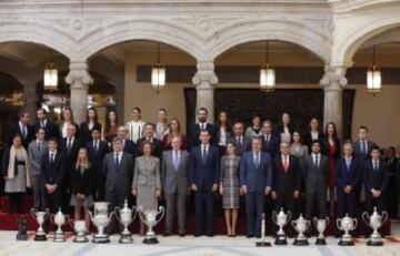 Los Reyes de España, Felipe y Letizia, acompañados por don Juan Carlos y doña Sofía, el ministro de Educación, Íñigo Méndez de Vigo (5d, abajo) y el presidente del CSD, Miguel Cardenal (3i, abajo), entre otros, posan para la foto de familia con los galardonados durante la ceremonia de entrega de los Premios Nacionales del Deporte 2014.