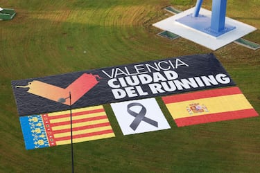 FOTO: DAVID GONZALEZ / DiarioASUna bandera gigante con las señeras de España y de Valencia, con un gran crespón negro en medio junto a la salida de la carrera.