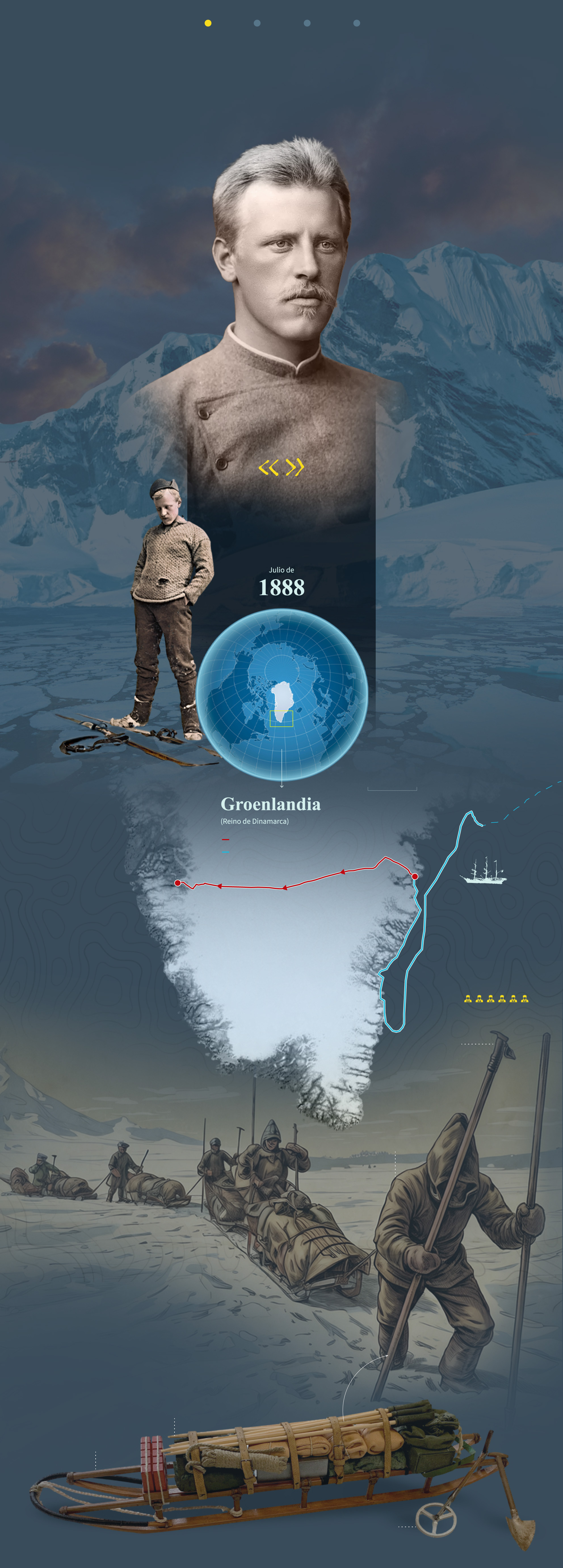 Oceanógrafo, zoólogo, diplomático, neurólogo... Son algunas de las mil y una facetas en las que destacaba el polifacético noruego Fridtjof Nansen, sin olvidar la que probablemente fue determinante para tener éxito en sus intrépidas aventuras como explorador: ser un excelente esquiador. Eso le llevó a convertirse, junto a las cinco personas que formaron parte de su expedición, en el primer hombre que atravesó Groenlandia a pie. Y lo hizo gracias a unos esquíes de madera que diseñó el mismo. Una hazaña que le hizo pasar a la historia.