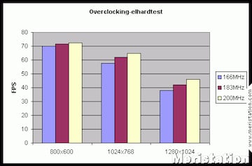 El overcloking únicamente comienza a dar sus frutos cuando se lleva la tarjeta 200MHz, velocidad a la que no se observan problemas de texturas corruptas. Estos resultados muestran que la diferencia entre la versión OEM y la retail no merece la diferencia de precio existente, especialmente si las memorias son de 5,5ns, lo que permitirá forzar las tarjetas hasta 200MHz.