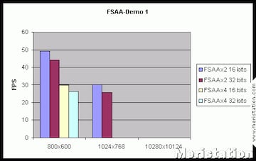 No obstante, este test si es algo más concluyente a la hora de mostrar el comportamiento de la Radeon bajo 32 bits, donde la pérdida de rendimiento es realmente mínima, hecho que se ha visto refrendado en las pruebas bajo Quake III a 32 bits. No puede decirse lo mismo de los resultados obtenidos activando el antiescalado, pues a 1024x768 y empleando solo 2 muestras, la pérdida de rendimiento es de un 60% aproximadamente.