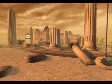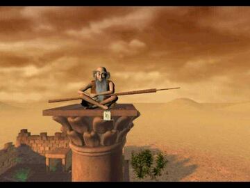 Llegamos a unas ruinas y oímos una voz a la que respondemos con "SI". Usamos el cubo. Cogemos el hueso (corazón) de la manzana y ahora vemos al tipo que nos habla. Cogemos la cuerda y la bolsa de lino. Hablamos con Stylite que así se llama, sobre Proclio Pitalos dos veces. Vamos hasta el Templo en ruinas y cogemos una piedra de la arena.