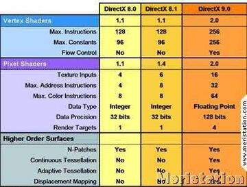 - Vertex y Pixel Shaders 2.0. Con la nueva versión de DX9, los PS y VS son totalmente programables y trabajan en coma flotante, con lo que la precisión de los cálculos mejora notablemente. Además, ahora se dispone de control de flujo (bucles, condiciones, etc) tanto estático como dinámico.