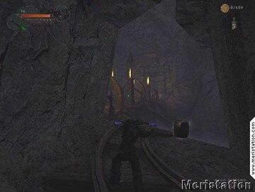 Lo cruzaremos y avanzaremos hasta unas estructuras de madera con casetas. Nos enfrentaremos a los arqueros elfos y a los caballeros; antes de subir por las escaleras, nos introduciremos por un pasillo entre paredes de roca que oculta oro y una joya. Subiremos pues por las escaleras, y en lo alto de todo encontraremos el Punto de Guardado Activo. Veremos que hay una vagoneta custodiada por un mago superior, al que deberemos eliminar. Una vez conseguido, colocaremos la bomba en ella y la accionaremos ( tecla E ).