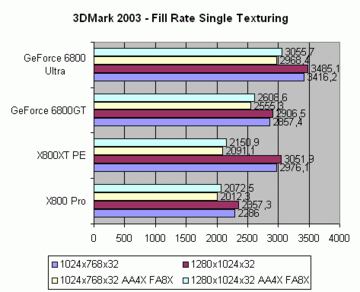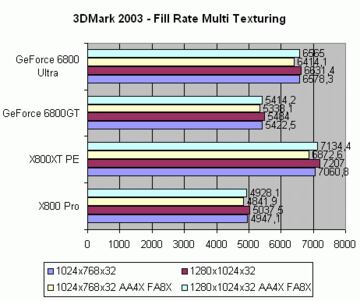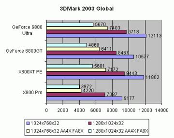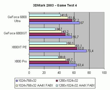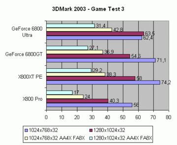 Todos los test en el 3D Mark 2003 se han hecho en "Máxima Calidad", esto es: AA6X FA16X para ATI, AA8X FA16X para NVIDIA.