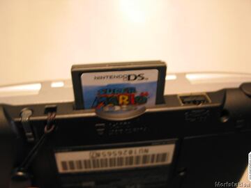 Aún sin abrirla, dejando lo mejor para el final, podemos observar dos Slots diferentes, uno en la parte superior y otra en la inferior, en situaciones opuestas entre si, que están pensados para albergar juegos de DS y GBA simultáneamente. De esta forma, podremos tener 2 juegos introducidos en nuestra DS a la vez, y desde el menú de inicio de la consola decidir a cual queremos jugar. Algo muy cómodo, y muy necesario, pues el tamaño de los cartuchos de DS es mucho mas reducido que los de GBA, y por primera vez, tienen un formato totalmente diferente, haciendo imposible usar el mismo Slot para ambos tipos de juego. Hasta ahora, cualquier cartucho desde que salió la primera GB entraba en todas las maquinas, pero esto llegó a su fin. Es tiempo de evolucionar a sistemas mas compactos y de mayor capacidad. De hecho, estos nuevos cartuchos tienen una capacidad máxima de 1 gigabit, o lo que es lo mismo, 128 megabytes.