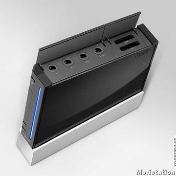 En su parte frontal, dispone de tres botones bastante típicos, como son power, reset y eject. También dispone de una ranura para las tarjetas SD. En la parte superior pueden verse los límites de las tapas que ocultan las conexiones para la compatibilidad con GameCube (cuatro mandos y dos tarjetas). Los puertos USB quedan relegados a la parte posterior.