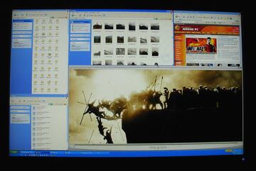 Lo primero que llama la atención es que es necesario mover la cabeza para mirar de un extremo al otro del escritorio. No es viable ver webs, documentos o simples carpetas con la ventana 'maximizada', es demasiado grande. En este tamaño tres páginas web pueden 'convivir' totalmente abiertas, sin sobreponerse entre ellas y nos sobra espacio. Hacemos algunas pruebas con Photoshop, documentos Word, el Outlook como podréis imaginar, cuanto más grande es el monitor, más ventajas encontraremos. Realmente el espacio es un lujo. El 30' supera con matrícula de honor cualquier prueba o situación que tenga que ver con ofimática, diseño, grafismo