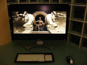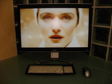 Pasamos a ver cine. El escalado requerido para transformar los 720x576 píxeles de un DVD en los 2560x1600 del Dell es tarea imposible. Dependiendo del formato original del DVD, llenará más la pantalla, pero se limitará a las ¾ partes del área total del monitor. En cuanto a la calidad de la imagen, si usamos el monitor como tal, apreciaremos en exceso cualquier error, degradación y demás problemas del vídeo digital. Es necesario retirarse unos metros y usar el monitor como una TV para un visionado satisfactorio. En todo caso, los 14ms se muestran demasiado lentos como para pasar desapercibidos en una película con constantes movimientos de cámara y acción en pantalla. En resumidas cuentas, ver un DVD en este magnífico monitor no saca ventaja alguna de su tamaño o resolución, por lo que no puede ser recomendado para ello.