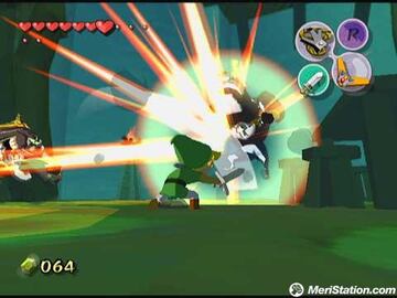 Asimismo, las grandes cabezas de los personajes y los enormes y pronunciados rasgos, como los ojos, las cejas o la boca, proporcionan a éstos una elocuencia que va más allá de toda palabra pronunciada. Es un una muy buena manera de acentuar increíblemente la expresividad, y si no fijaos en la cara de Link cuando pasa por un lugar estrecho con la espalda arrimada a la pared. Cabe decir que pese a toda novedad, The Wind Waker cuenta con una mecánica de juego prácticamente idéntica a la de sus predecesores de Nintendo 64, con algunas mejoras, sobre todo en materia de lucha con espada. Tras recibir un intenso entrenamiento en nuestra isla de origen, dominaremos todo un abanico de golpes y técnicas nuevos con los que hacer frente a los distintos enemigos. Además, el bloqueo de blancos que ya había creado escuela en Nintendo 64 repite una vez más facilitándonos los combates frente a múltiples adversarios.