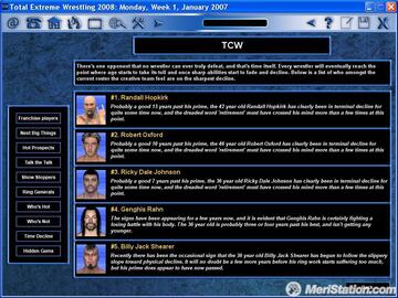 Dejamos el deporte rey en España para entrar de lleno en una modalidad de lucha conocida por todos. Originalmente pensado como juego de cartas coleccionables, y bajo el nombre de Extreme Warfare, comenzaron las andanzas de un simulador bastante atractivo para los usuarios debido a la gran cantidad de opciones disponibles, y a la poca variedad de productos que tratasen el mismo tema. El juego nos permite controlar el destino de un luchador profesional, decidiendo en que eventos participar, que llaves aprender o la forma de gastar nuestro tiempo de entrenamiento diario. Su versión Total Wrestling 2005 fue liberada en julio del pasado año, y si bien no es la más reciente (existen una de 2007 y otra de 2008), al menos es gratis.