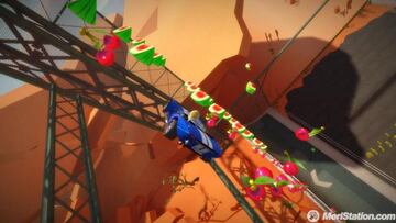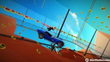 A propósito de los vehículos, tendremos a nuestra disposición varios modelos distintos, la mayoría de los cuales tendremos que desbloquear a medida que ganemos fans (que vienen a ser los puntos que conseguiremos superando retos, realizando acrobacias, recogiendo fichas de fans o terminando la carrera en un tiempo record). El grueso de los modos de juego lo componen el modo Carrera Pro, el modo Carrera de Combate y Carrera Xbox Live. Estos se complementan con varios minijuegos que se centran en aspectos muy concretos del juego, como el turbo o las acrobacias. La opción más atractiva es, a nuestro juicio, la Carrera de Combate. Al más puro estilo Mario Kart. En ella, podremos recoger cajas repartidas por el circuito que nos proporcionarán valiosos ítems con los que podremos deshacernos de nuestros rivales o conseguir alguna ventaja. En el primer grupo encontramos, por ejemplo, la mina flotante y los cohetes, y en el segundo la teleportación y la supervelocidad. Pero, ¡no tenemos botones! ¿Cómo podemos usarlos? Muy sencillo. Al recoger un objeto, éste se situará al lado izquierdo del conductor. Bastará con extender el brazo hacia él para activarlo.